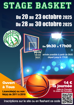 L'Hirondelle Basket organise un stage, ouverts à tous les licenciés et non licenciés, de la catégorie U9 à U15 (né(e) entre 2018 et 2011) pendant les vacances d'automne.